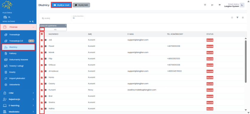Możesz teraz z łatwością wyfiltrować osoby, które zalegają z opłatami za kurs, sprawdzić za które raty i ile dni zwlekają z zapłatą. Pojawiły się tam dwa statusy Dłużnik i Nie dłużnik, dzięki którym możesz pozostawić na liście wyłącznie osoby, które chcesz poinformować o zaległościach lub wysłać przypomnienie o zbliżającym się terminie.