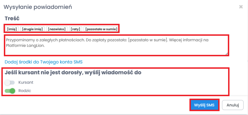 Treść wiadomości możesz dowolnie edytować, dokładnie tak samo jak w przypadku maila. Możesz też zdecydować czy w przypadku kursantów niepełnoletnich wiadomość ma zostać wysłana do rodzica.