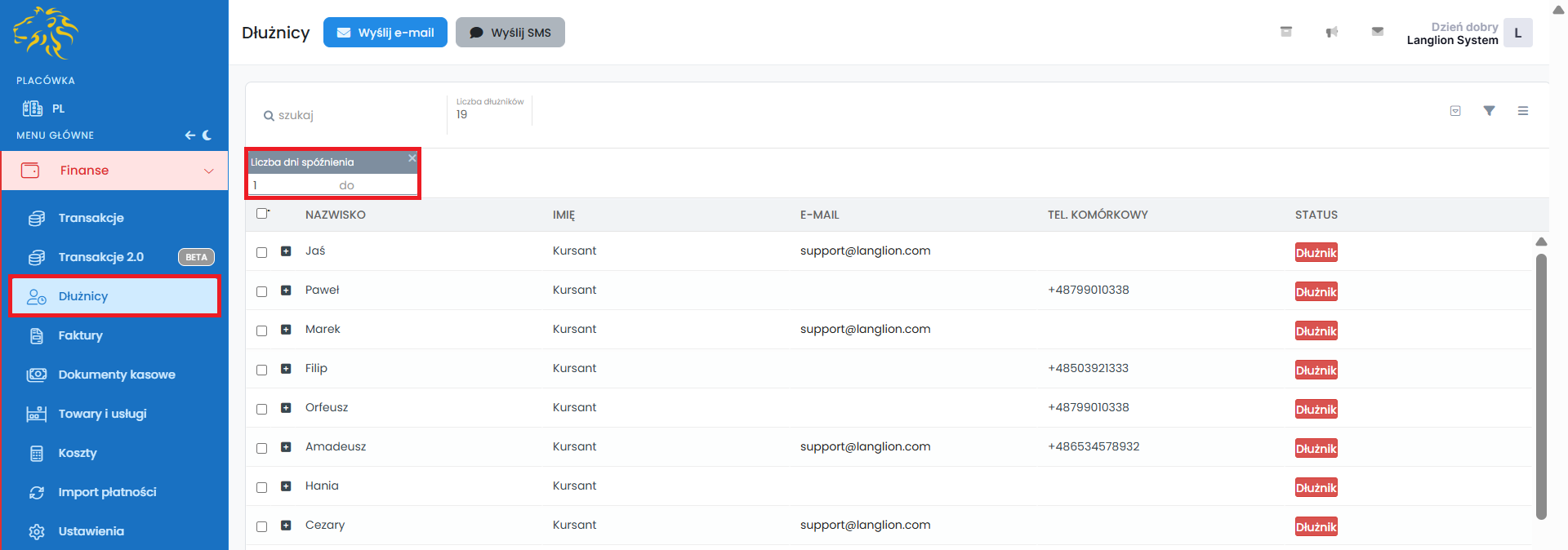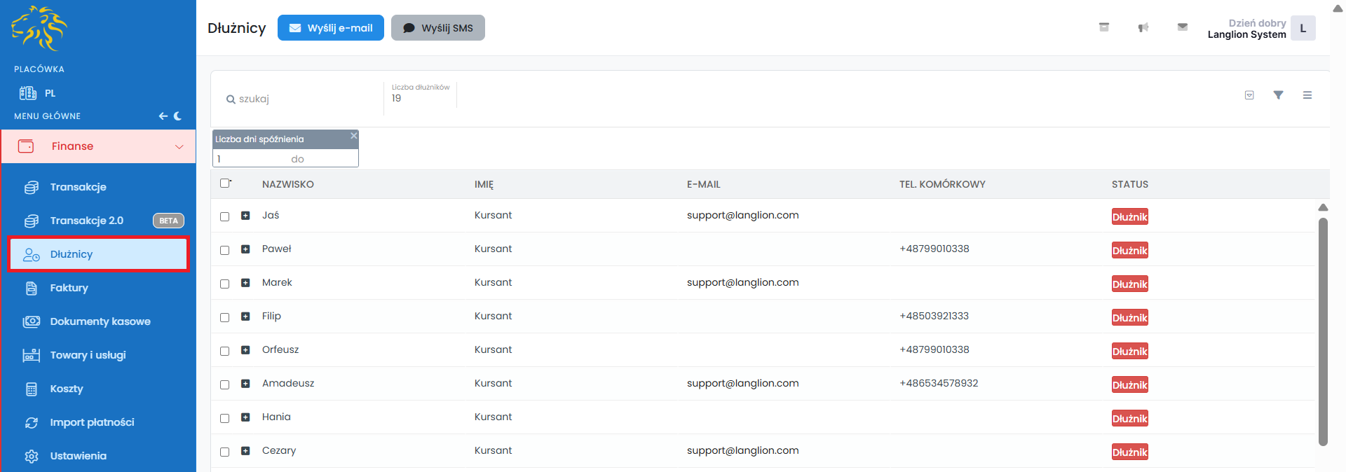 Możesz teraz z łatwością wyfiltrować osoby, które zalegają z opłatami za kurs, sprawdzić za które raty i ile dni zwlekają z zapłatą. Pojawiły się tam dwa statusy Dłużnik i Nie dłużnik, dzięki którym możesz pozostawić na liście wyłącznie osoby, które chcesz poinformować o zaległościach lub wysłać przypomnienie o zbliżającym się terminie.