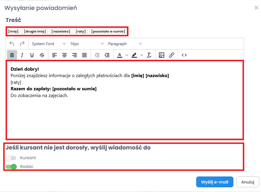 Treść wiadomości możesz dowolnie edytować, dokładnie tak samo jak w przypadku maila. Możesz też zdecydować czy w przypadku kursantów niepełnoletnich wiadomość ma zostać wysłana do rodzica.