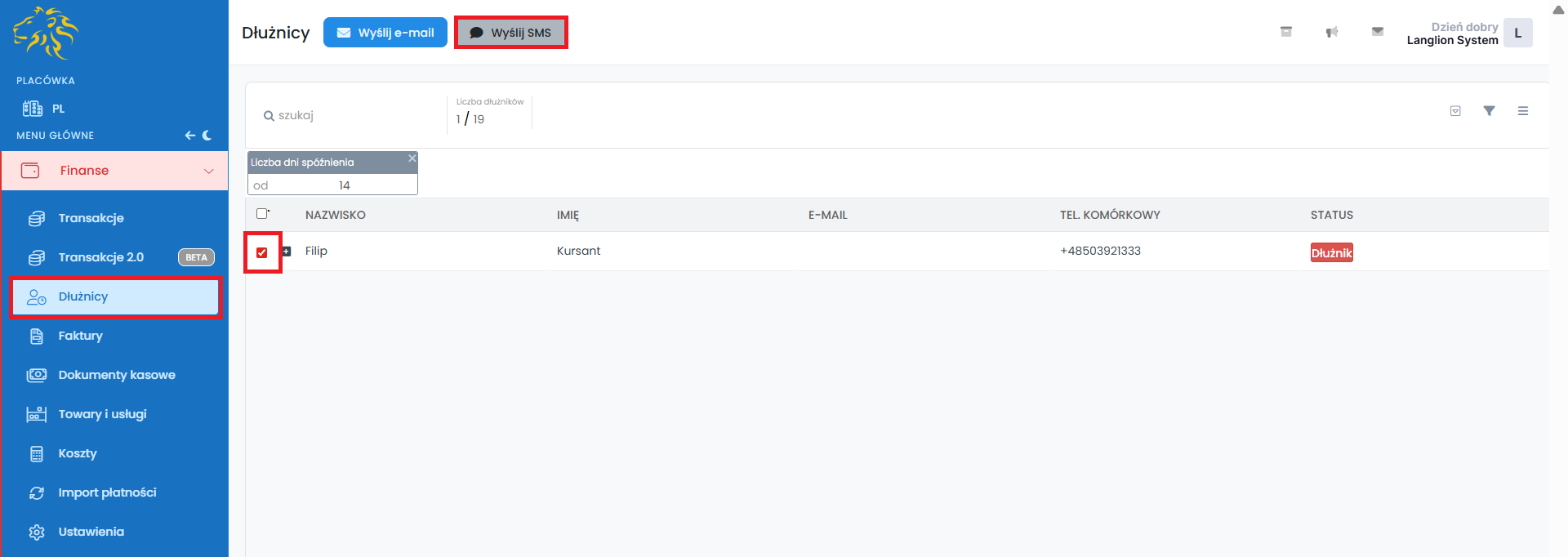 Po zaznaczeniu odbiorców na liście dłużników, kliknij w przycisk „Wyślij SMS”.