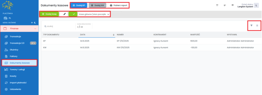 Główną częścią zakładki Dokumenty kasowe jest lista dokumentów KP i KW. Możesz filtrować listę w zależności od potrzeb. Lista dokumentów kasowych może także być przeniesiona do arkusza kalkulacyjnego.