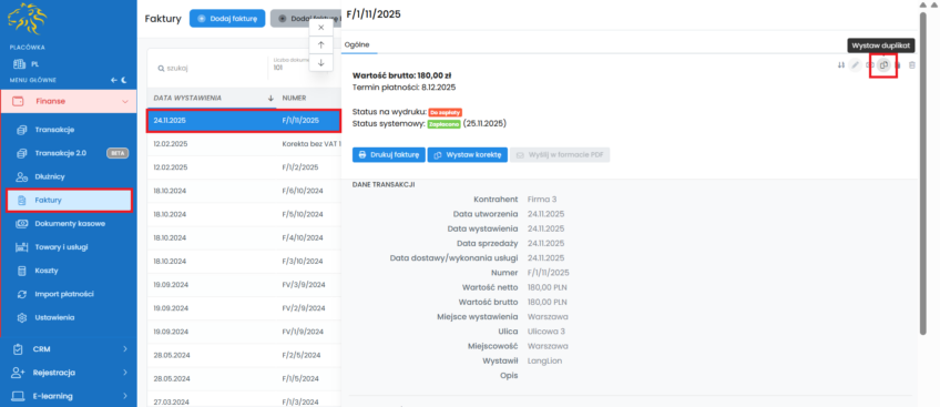 - Przejdź do zakładki Faktury w module Finanse i wybierz na liście dokument do którego wystawiasz duplikat,