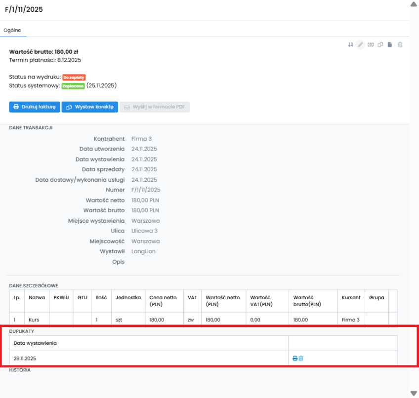 - Po prawej stronie należy kliknąć na ikonę Wystaw duplikat,