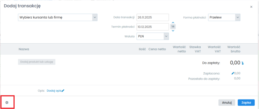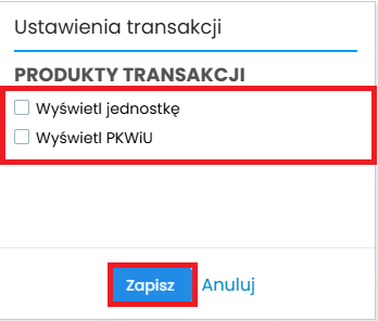 Po kliknięciu „Dodaj transakcję” wybieramy ikonę ustawień w lewym dolnym rogu formularza. Zaznaczamy te dane, które chcemy aby dodatkowo zaciągały się do transakcji (numer PKWiU, jednostka) i zapisujemy zmiany.