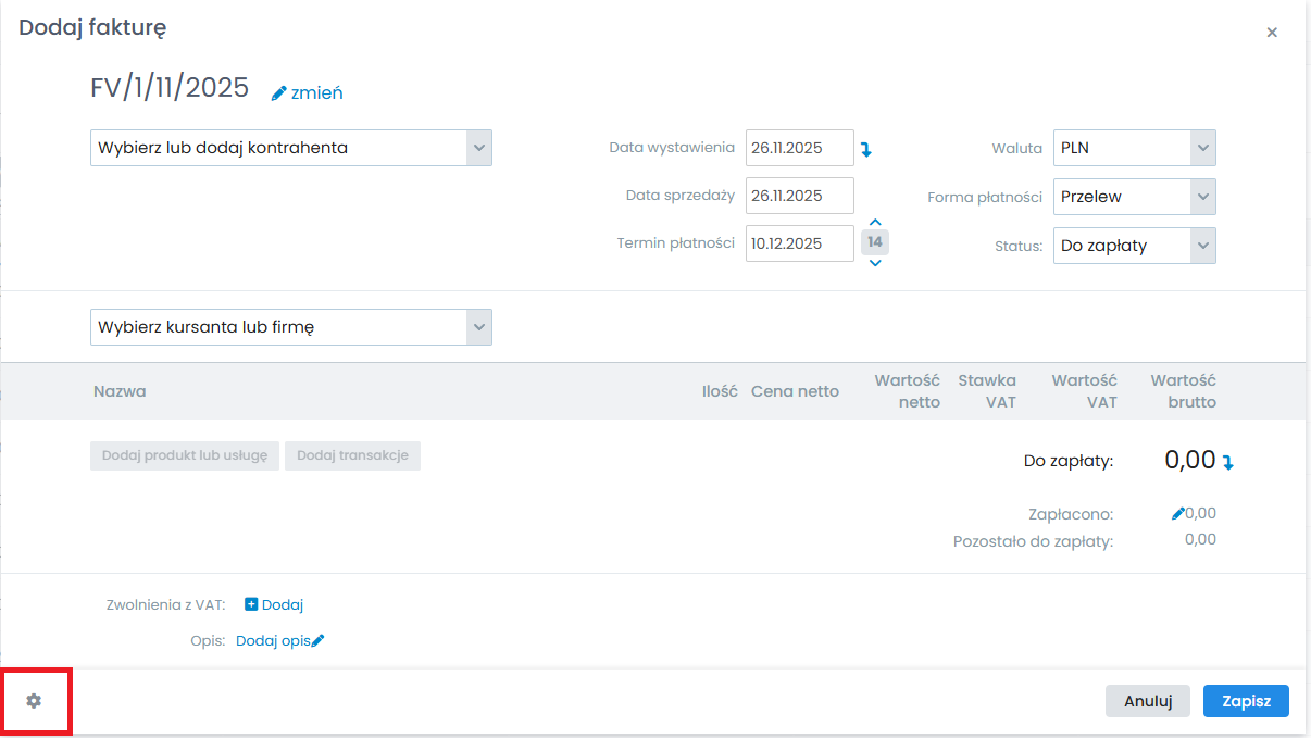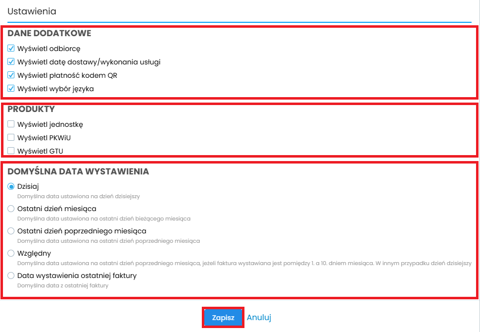 Po kliknięciu „Dodaj fakturę” czy „Dodaj fakturę bez VAT” wybieramy ikonę ustawień w lewym dolnym rogu formularza. Zaznaczamy te dane, które chcemy aby dodatkowo zaciągały się na fakturę, np. dane odbiorcy (np. jednostki samorządu terytorialnego) i zapisujemy zmiany.