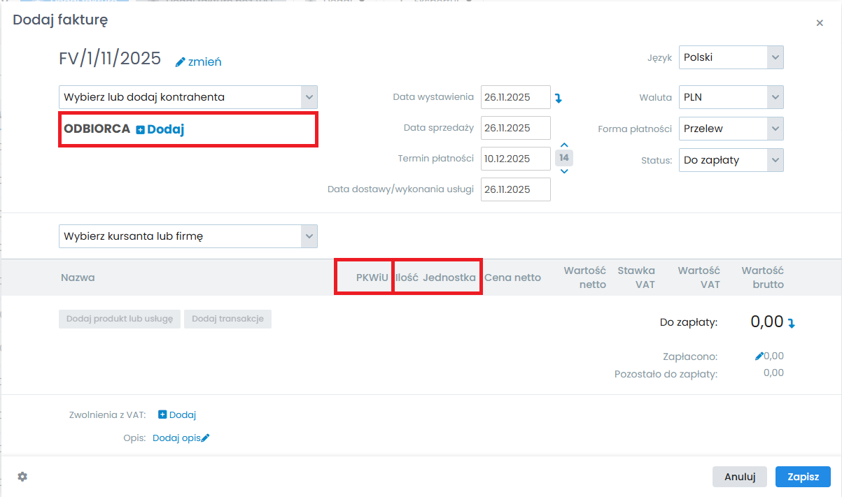 Domyślnie w systemie wyświetla się podstawowy formularz dodawania transakcji oraz faktur. Zdarza się jednak, że szkoły potrzebują zamieszczenia dodatkowych informacji o towarze lub zamieścić dane odbiorcy na fakturze.