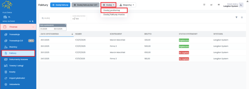 Tworzenie proform to dodatkowa możliwość potwierdzania transakcji. W Platformie LangLion możesz również wystawiać proformy.