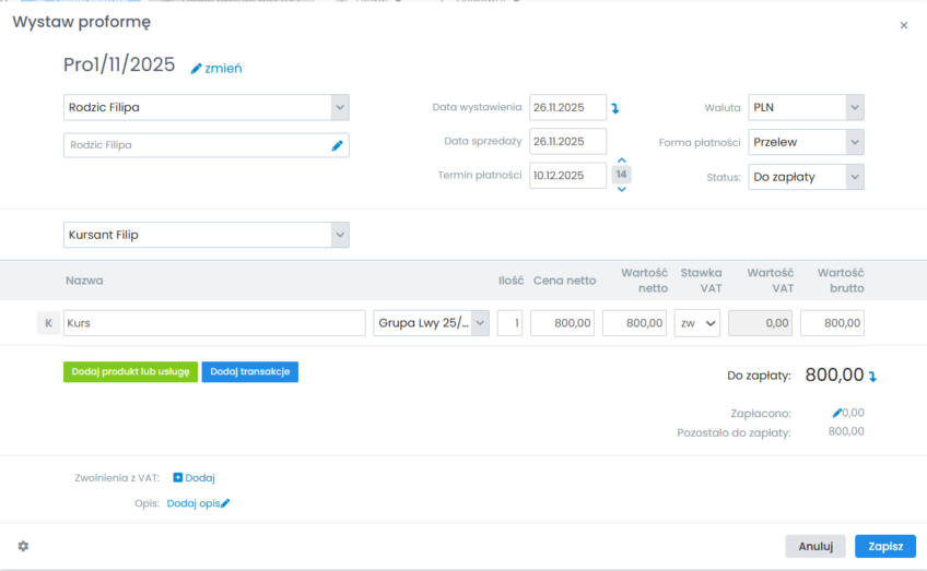 Gotowe, proforma została utworzona. Po opłaceniu jej przez kursanta, możesz utworzyć fakturę.
