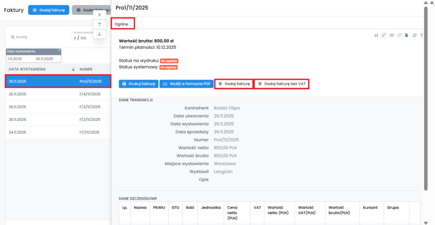 Nic trudnego, odszukaj zapisaną proformę i w zakładce „Ogólne”, kliknij „Dodaj fakturę” lub „Dodaj fakturę bez vat”.
