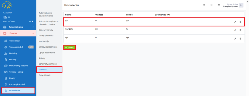 W celu poprawnego skonfigurowania listy towarów, zdefiniuj najpierw z jakich stawek VAT korzystasz w swojej firmie. Aby utworzyć listę stawek, przejdź do modułu Finanse i wybierz Ustawienia a następnie Stawki VAT.