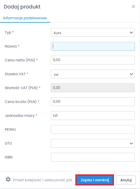 Dodając pozycje do zakładki „Towary i usługi” możesz wybrać następujące typy w edycji: produkt, usługa i kurs.