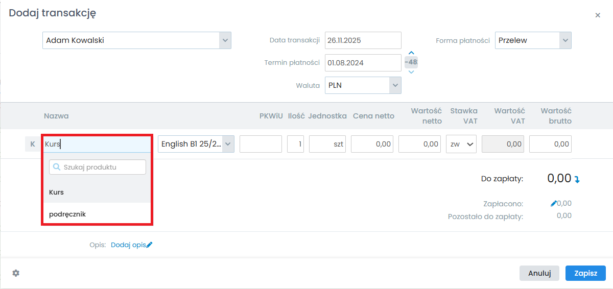 Dodając towar typu kurs, nie wpisuj jego ceny. System sam wyliczy należność w oparciu o stawkę w grupie. Przy rozliczaniu kursanta i dodawaniu wpłaty, wybierz towar o typie kurs – system wyszuka grupę do której student jest zapisany oraz zajęcia wygenerowane w tej grupie i na tej podstawie zaciągnie dane o wysokości należności.