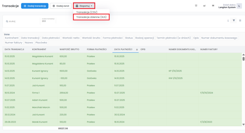 Jeśli chcesz wyeksportować listę dziennych transakcji, kliknij przycisk „Eksportuj” i określ za jaki okres czasu chcesz zaciągnąć plik xls.