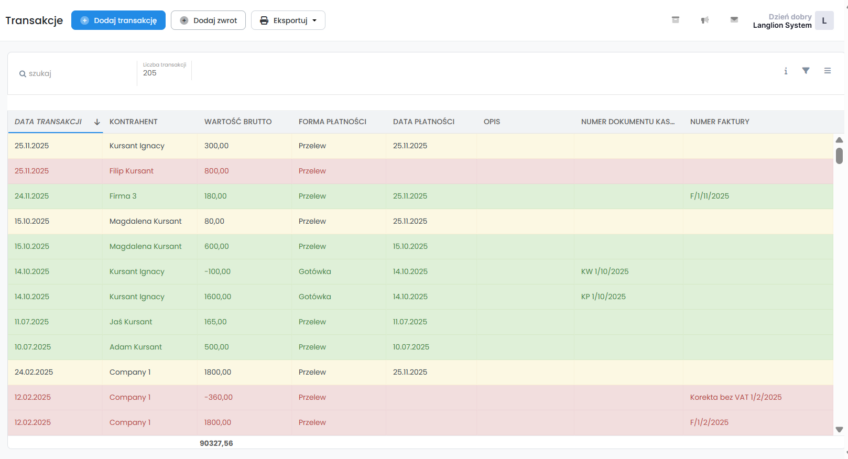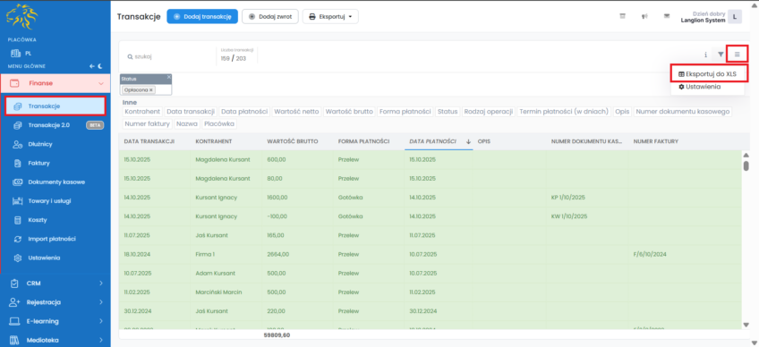 Zakładka „Transakcje” zawiera wszystkie wpłaty oraz zwroty, które zapisane zostały w wyniku rozliczania kursantów i firm. W zakładce tej masz możliwość zarządzania transakcjami poprzez: