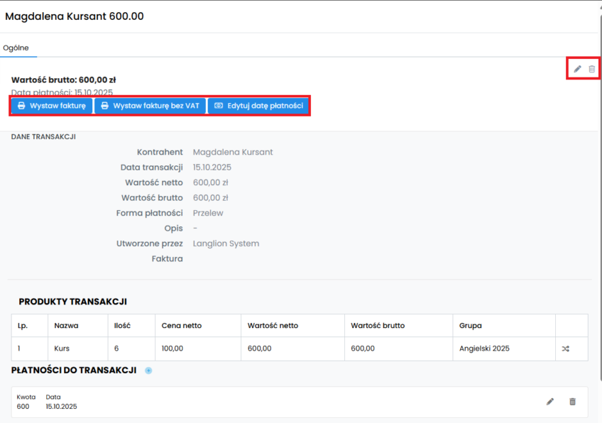Z poziomu tej zakładki możesz również edytować lub usunąć transakcję. Masz także możliwość wystawienia faktury do transakcji oraz potwierdzenia jej płatności, w przypadku zastosowania odroczonej formy płatności.