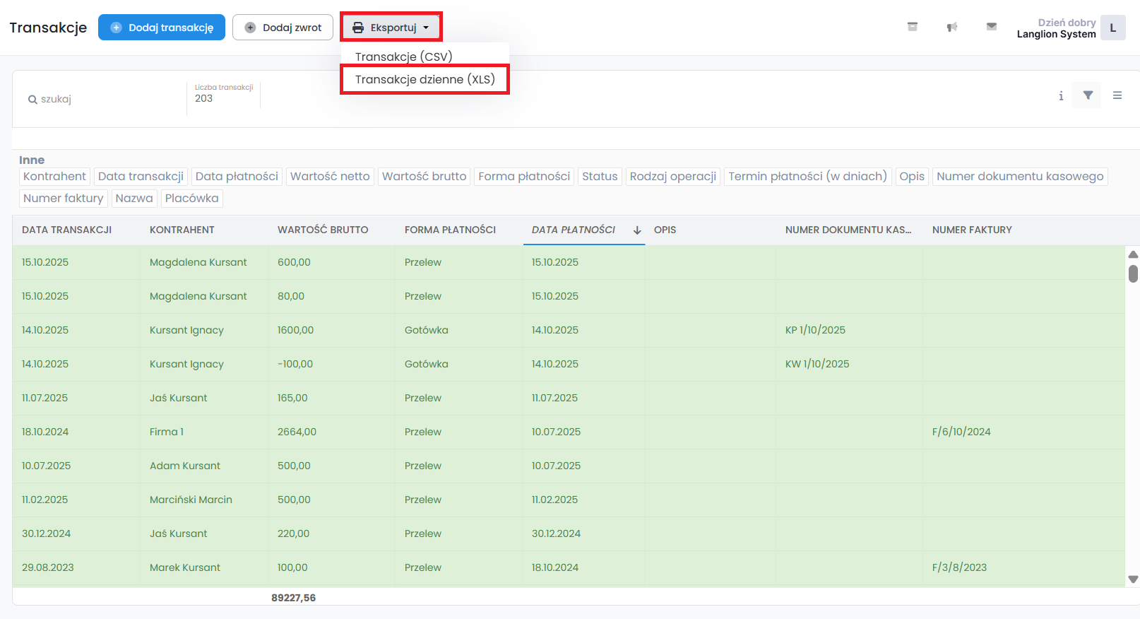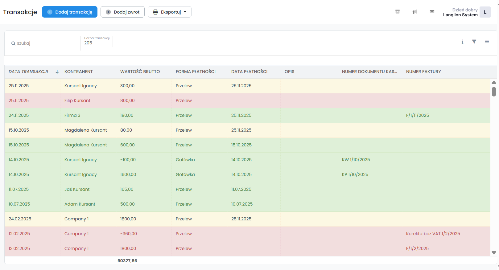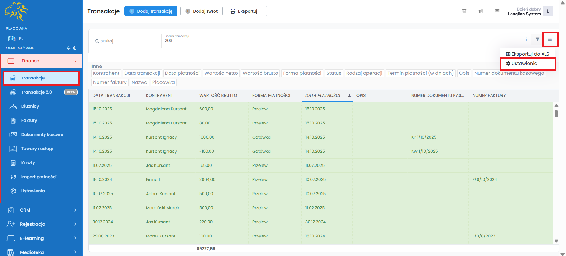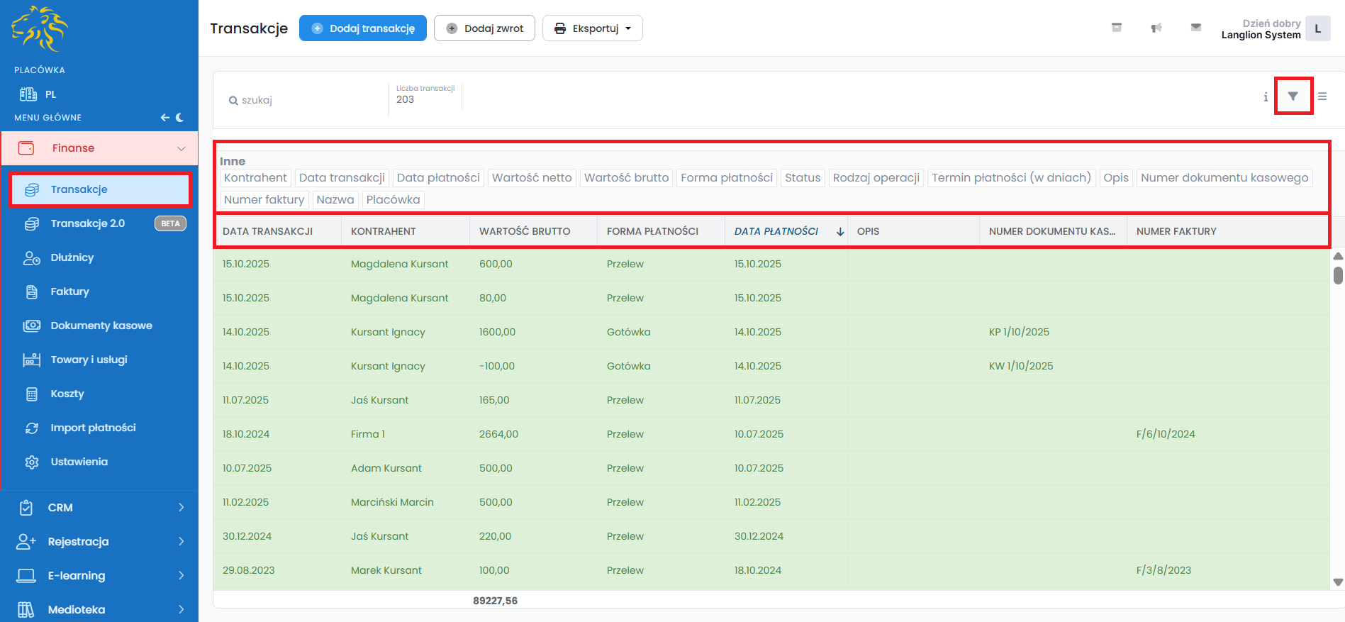 Zakładka „Transakcje” zawiera wszystkie wpłaty oraz zwroty, które zapisane zostały w wyniku rozliczania kursantów i firm. W zakładce tej masz możliwość zarządzania transakcjami poprzez: