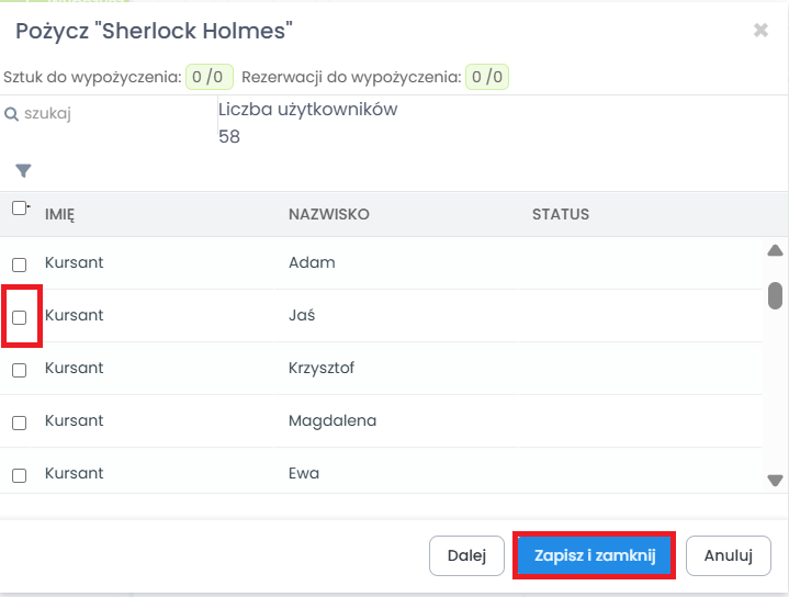 3. W kolejnym korku , wyszukaj właściwą osobę której chcesz wypożyczyć pozycję Medioteki i przejdź „Dalej”.