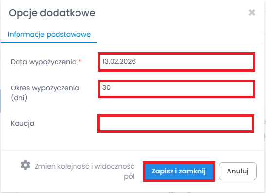3. Następnie uzupełnij informację o dacie wypożyczenia, liczbie dni – okresie wypożyczenia oraz kaucji.