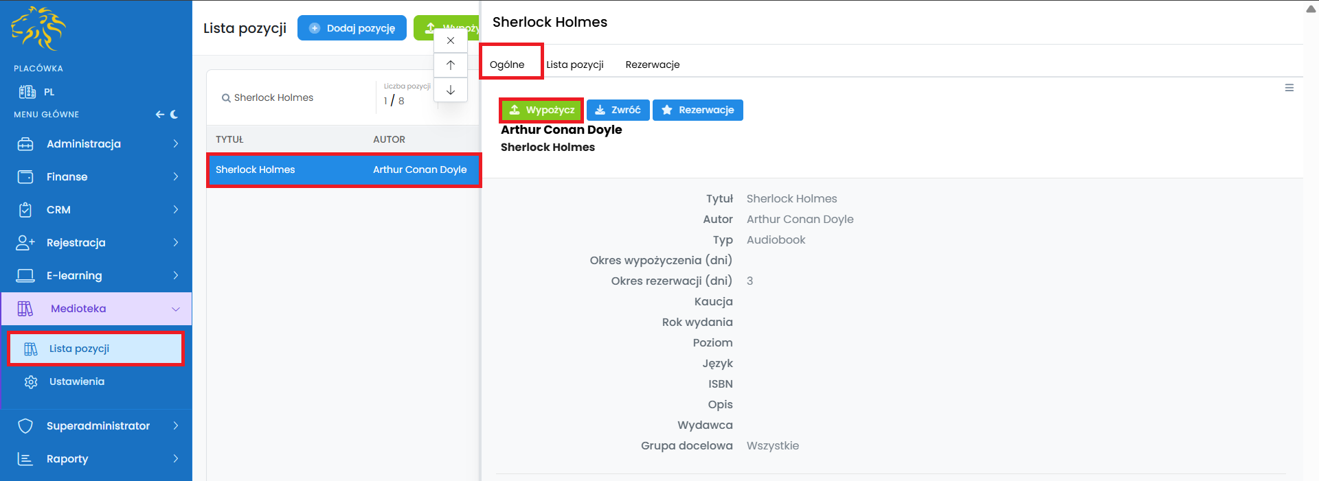 2. Następnie, z listy dostępnych pozycji Medioteki wybierz właściwą pozycję i w zakładce „Ogólne” kliknij w przycisk „Wypożycz”.