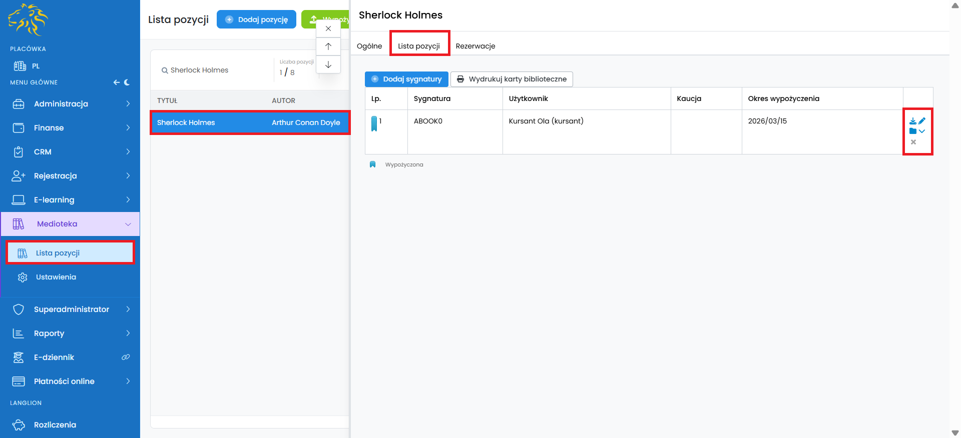 To proste, kliknij wybraną pozycję Medioteki  i przejdź do zakładki „Lista pozycji”.W zakładce tej wyświetlane są informacje, dotyczące listy wygenerowanych sygnatur dla wybranej pozycji. Niebieska flaga oraz imię i nazwisko użytkownika wskazuje na wypożyczenie danej sygnatury. Jeżeli ustawienia Medioteki zostały poprawnie skonfigurowane, dodatkowo wyświetlana będzie informacja o kaucji i okresie wypożyczenia pozycji.