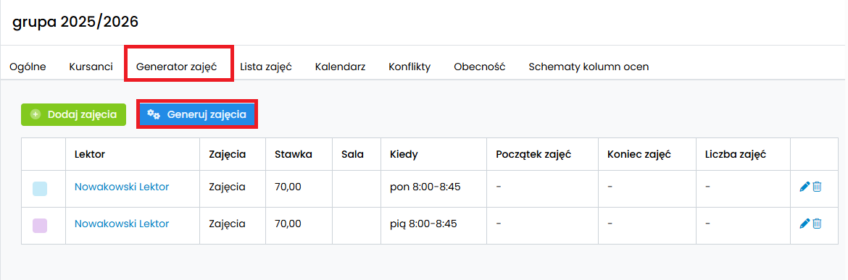 Po zapisaniu zmian kliknij „Generuj zajęcia”.