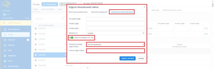 W nowo otwartym oknie przejdź do zakładki „Ustawienia niestandardowe”. Zaznacz opcję „Zajęcia dostępne on-line”, w polu „Dostawca usługi zajęć online” wybierz „Meeting link”, w polu Link do zajęć online wklej link i kliknij „Zapisz i zamknij”.