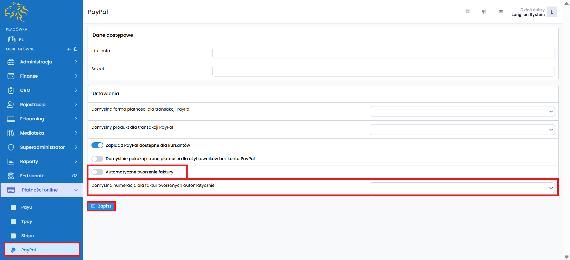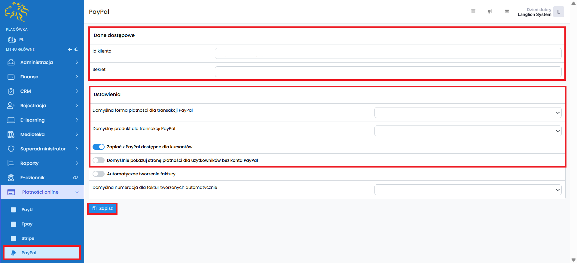 Możesz teraz uzupełnić dane na Platformie LangLion w zakładce Płatności online – PayPal
