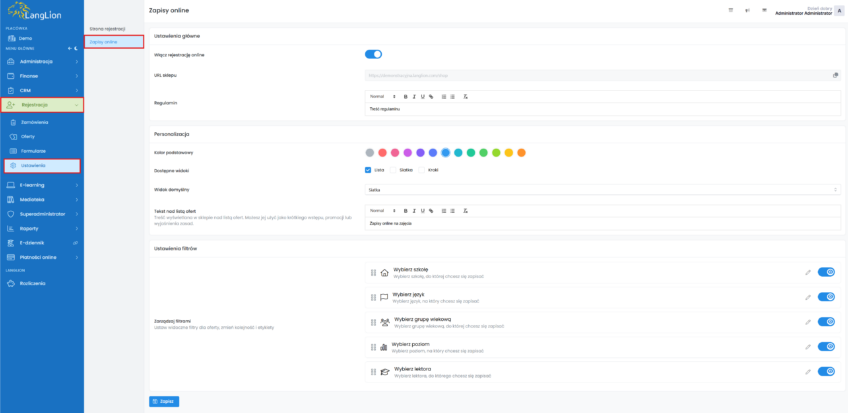 Aby aktywować zapisy online dla kursantów należy w ustawieniach głównych oferty włączyć opcję „Rejestracja włączona”.