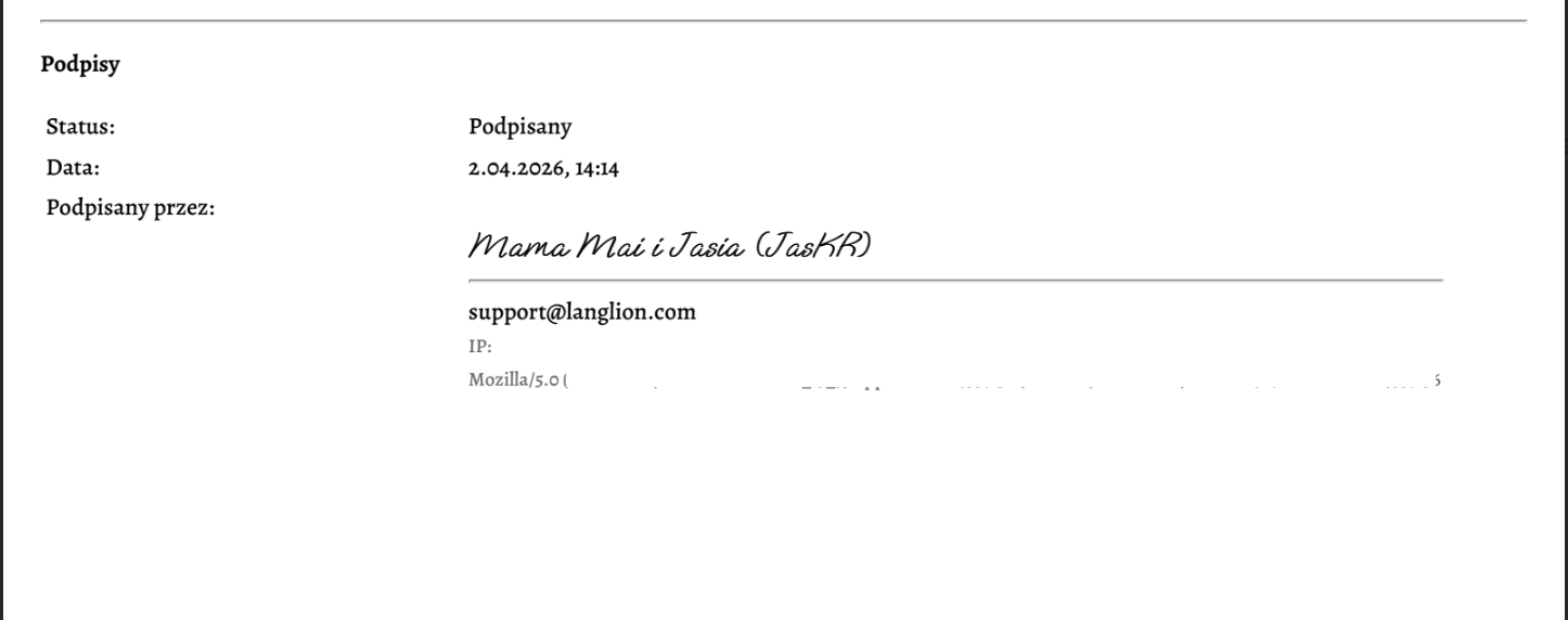 Po podpisaniu umowy online, na adres email osoby, która podpisała dokument wysyłane jest potwierdzenie akceptacji warunków umowy wraz z załączoną wersją pdf umowy.