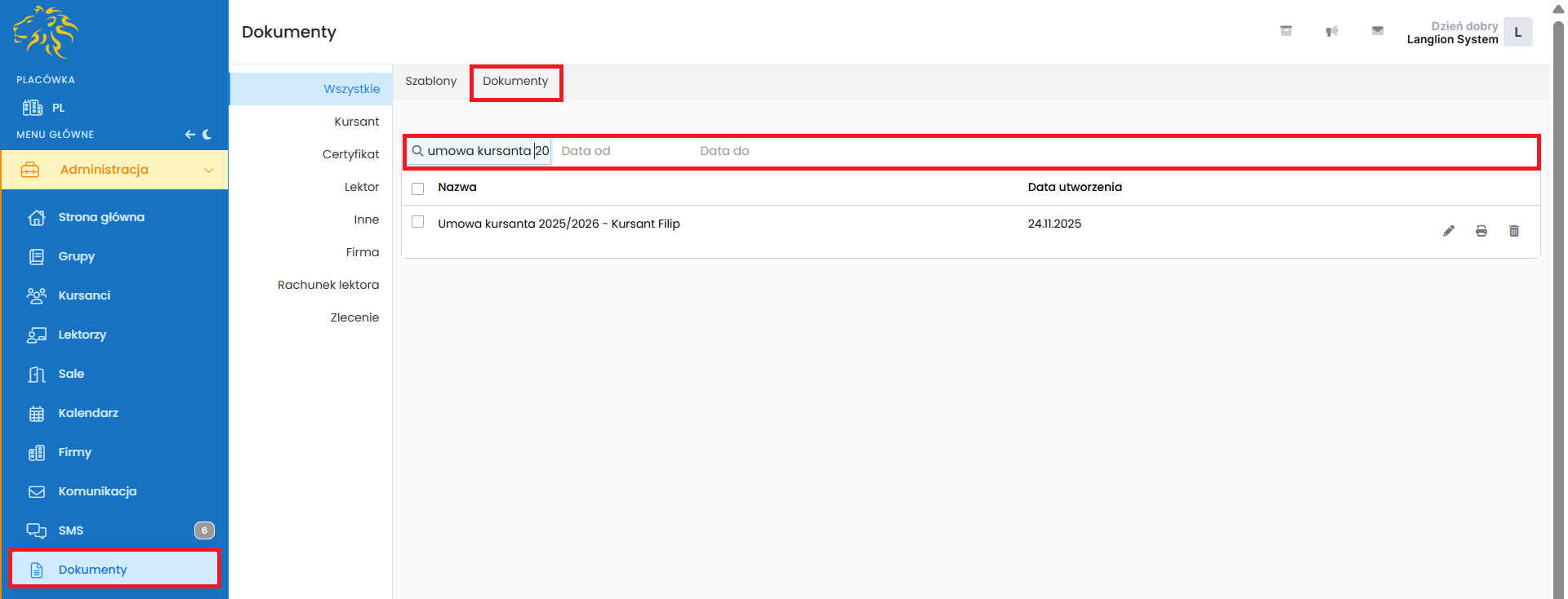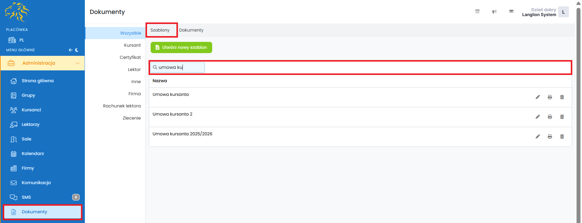 W celu łatwiejszego odnalezienia szablonu lub umowy możesz skorzystać z wyszukiwarki widocznej nad listą dokumentów. Kliknij w pole z lupą i wpisz szukaną nazwę szablonu, nazwisko kursanta czy numer szukanej umowy.
