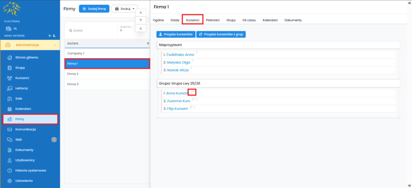 Wprowadź do systemu dane kursantów, stwórz odpowiednie grupy i przypisz je do firmy. Następnie w zakładce „Firmy” przejdź do „Kursanci” i wybierz opcję edycji danych kursanta w grupie.