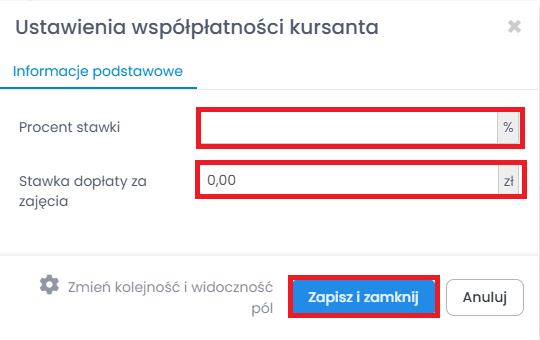 W zależności od tego czy kursant będzie opłacał stałą stawkę za zajęcia czy procent od niej, wprowadź odpowiednie dane.