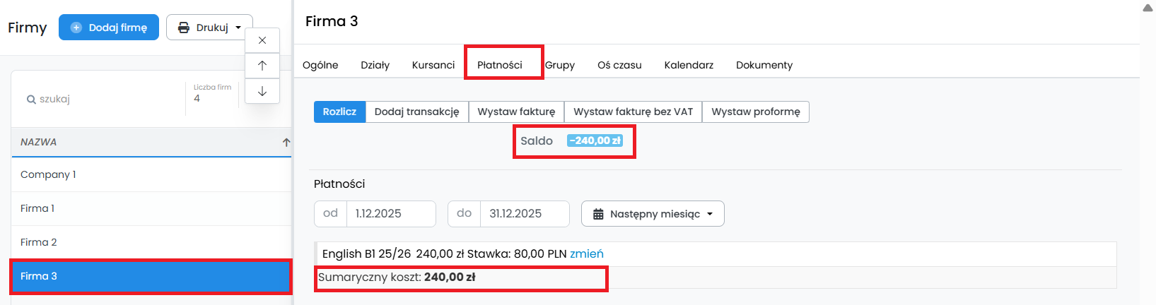Saldo firmy wskaże kwotę jaką powinna ona opłacić. Koszt sumaryczny to łącznie kwota do zapłaty przez firmę i kwota do zapłaty przez kursantów.
