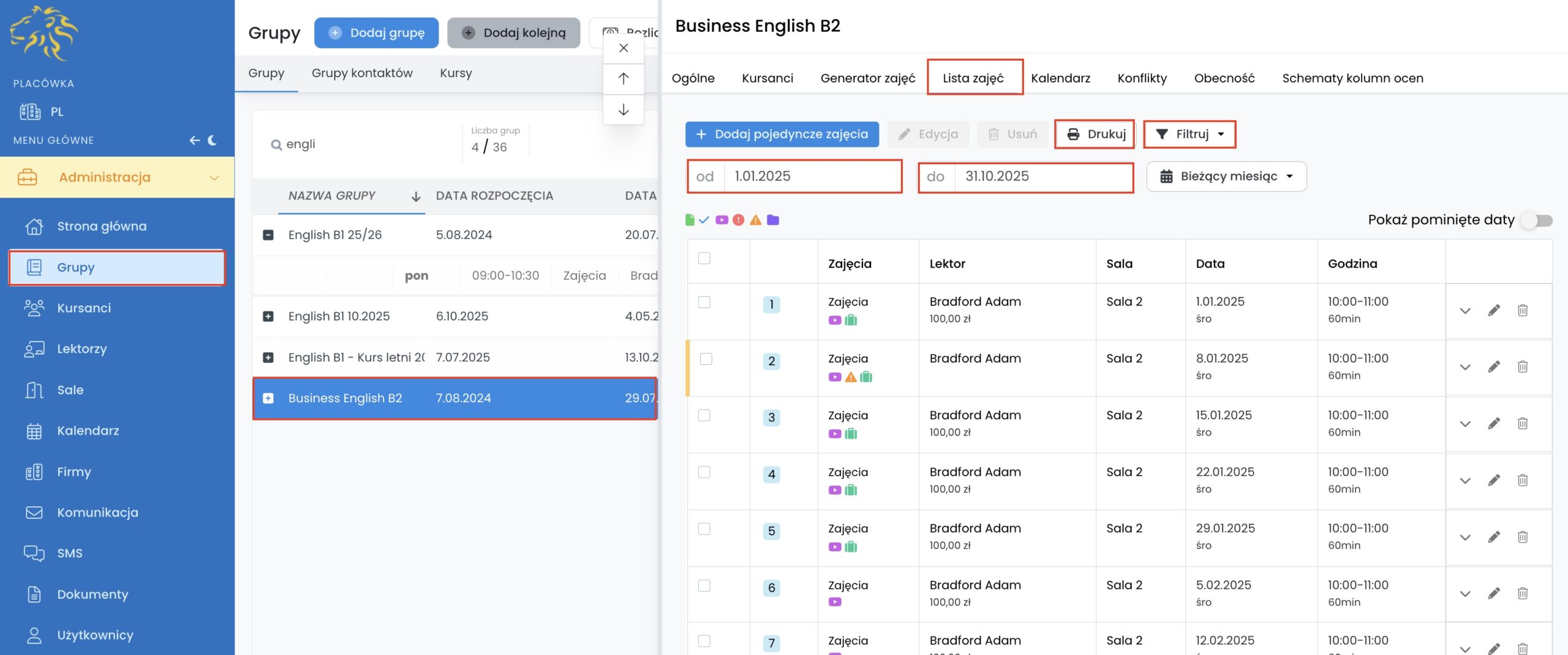 Może zdarzyć się sytuacja, gdy lektor lub kursant poprosi Cię o wydrukowanie listy zajęć w grupie.