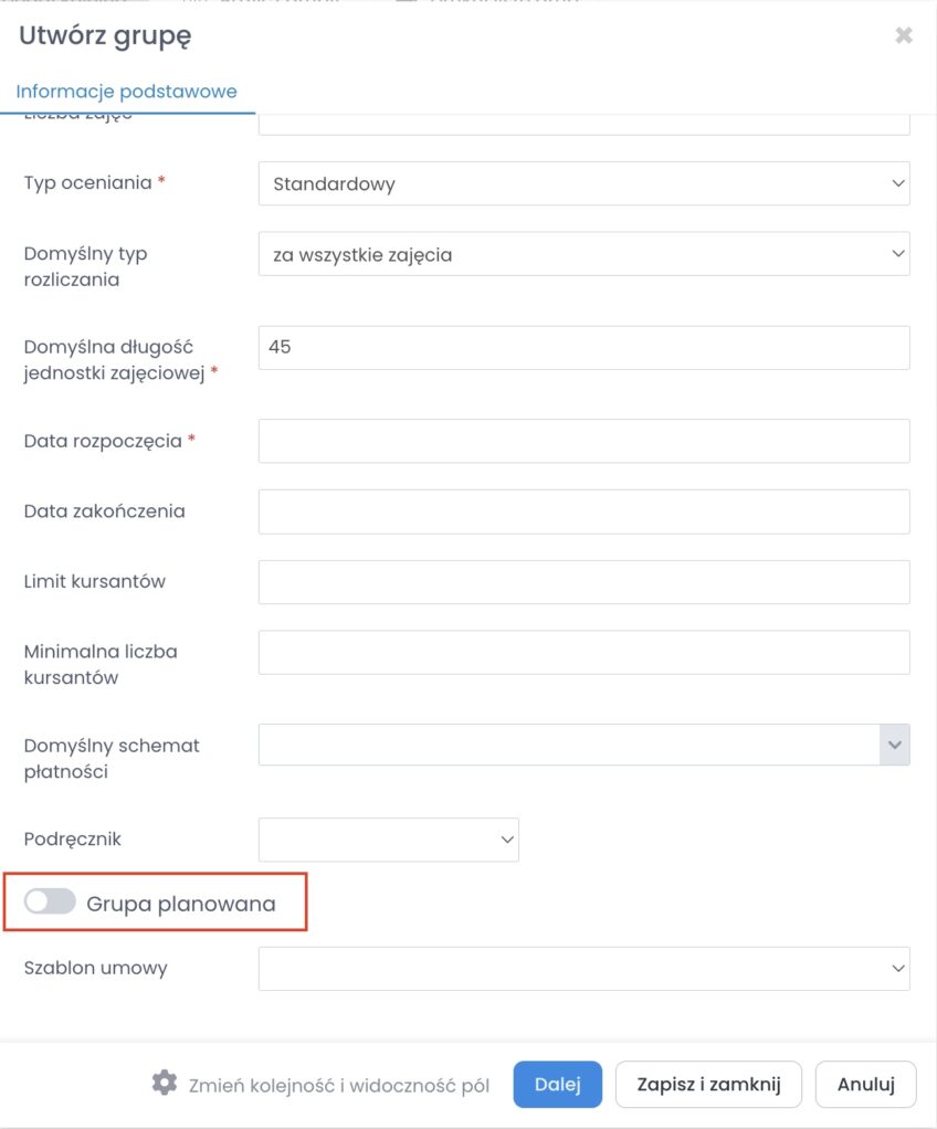 Gotowe, grupa jest oznaczona jako planowana (na liście grup podświetlona jest na pomarańczowo, a na kalendarzu jest podpisana jako planowana). Od tej chwili wszystkie jej dane nie będą widoczne dla lektora oraz kursanta.