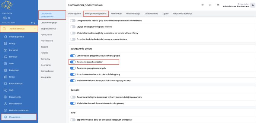 - W pierwszej kolejności, w module „Administracja„, przejdź do zakładki „Ustawienia” -> „Ustawienia podstawowe” -> „Konfigurację systemu”,zaznacz opcję „Tworzenie grup kontaktów” i zapisz zmiany. Pamiętaj, że teraz należy się przelogować w systemie.