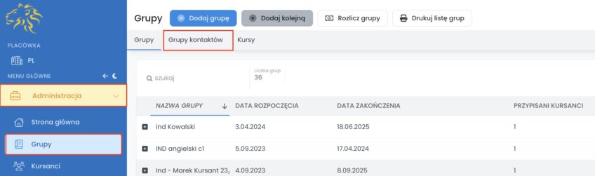 Usunięcie kursanta z listy w grupie kontaktów nie usuwa go z systemu, ani nie powoduje wypisania z grupy danego kursu.