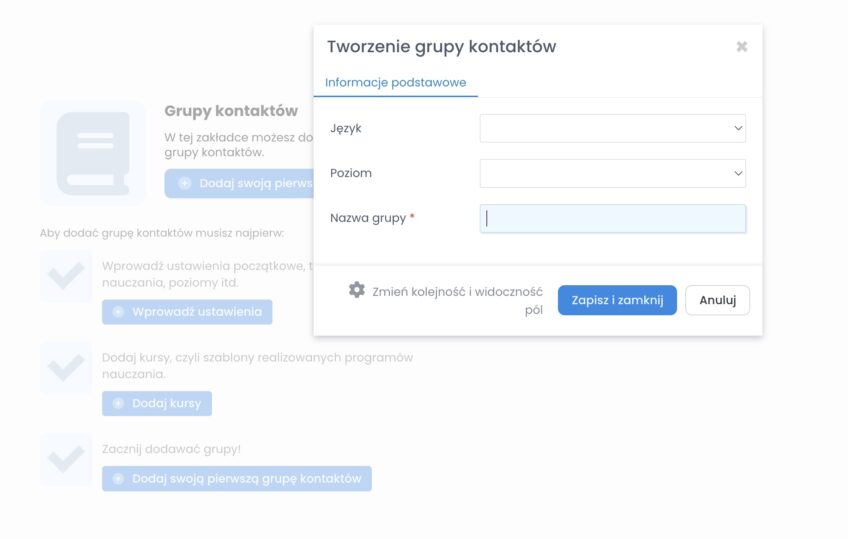 W nowym oknie wprowadź nazwę grupy kontaktów, możesz też dodać informacje o języku i poziomie. Zapisz zmiany.