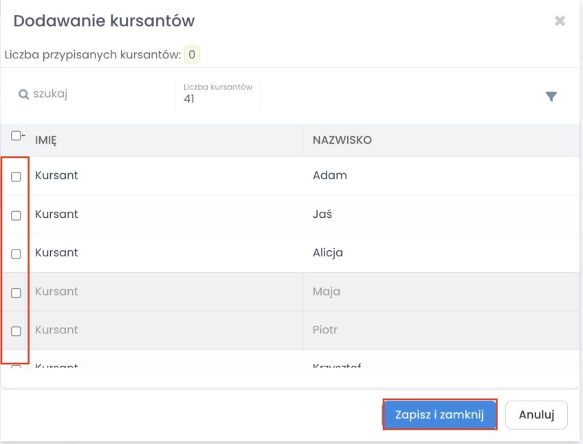 3. Teraz możesz przypisać do danej grupy kursantów. Zaznacz ich na liście i kliknij „Zapisz i zamknij”. Zwróć uwagę, że możesz użyć filtrów, aby łatwiej wyszukać odpowiednie osoby.