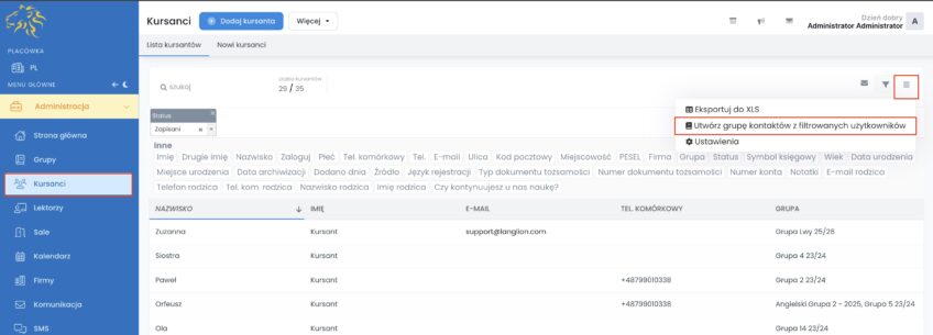 Przejdź do zakładki „Kursanci”, wybierz za pomocą filtrów odpowiednie osoby, np. te z konkretnej miejscowości. Następnie kliknij na opcję „Więcej” i wybierz „Utwórz grupę kontaktów z filtrowanych użytkowników”. Potwierdź komunikat systemowy i przejdź do edycji samej grupy. W nowym oknie możesz nadać jej odpowiednią nazwę.