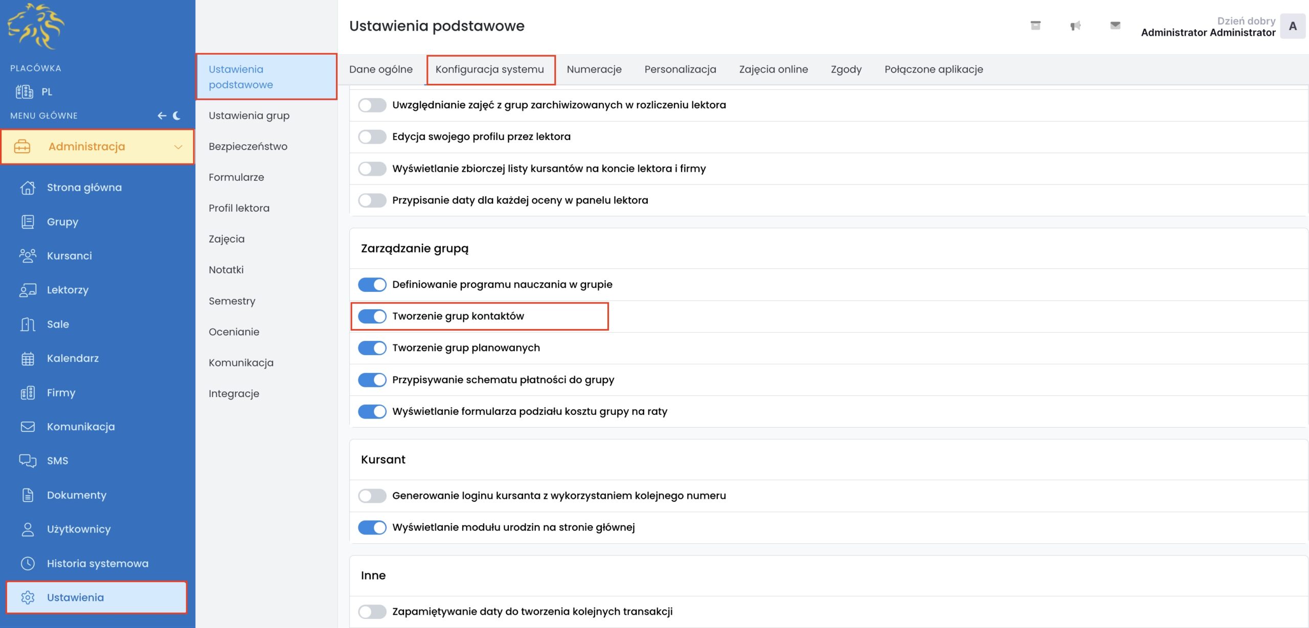 - W pierwszej kolejności, w module „Administracja„, przejdź do zakładki „Ustawienia” -> „Ustawienia podstawowe” -> „Konfigurację systemu”,zaznacz opcję „Tworzenie grup kontaktów” i zapisz zmiany. Pamiętaj, że teraz należy się przelogować w systemie.