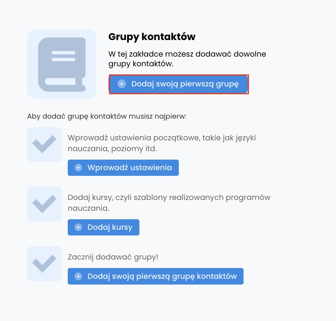 2. Przejdź do zakładki „Grupy”, a następie „Grupy kontaktów” i kliknij w przycisk „Dodaj swoją pierwszą grupę”.