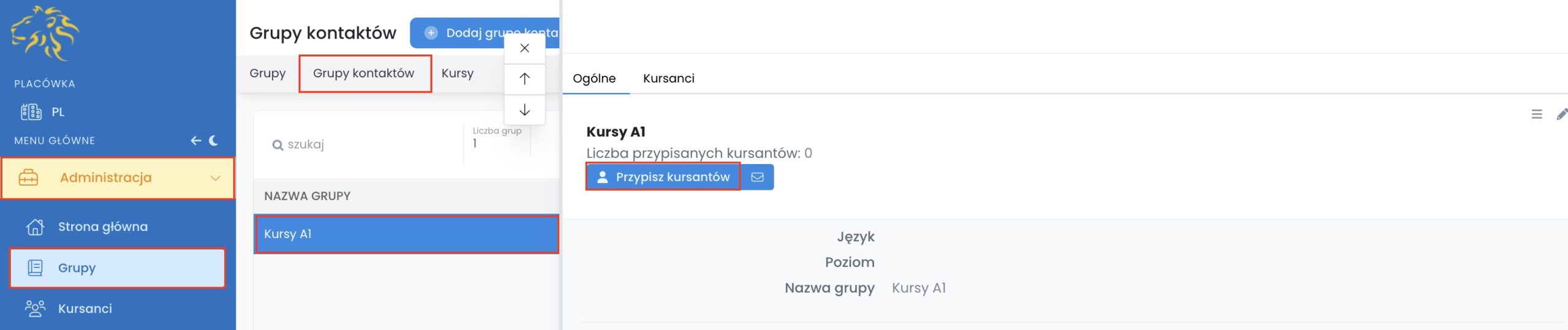 Usunięcie kursanta z listy w grupie kontaktów nie usuwa go z systemu, ani nie powoduje wypisania z grupy danego kursu.