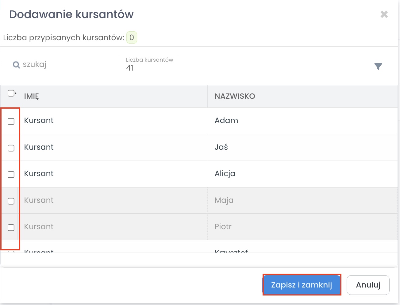 3. Teraz możesz przypisać do danej grupy kursantów. Zaznacz ich na liście i kliknij „Zapisz i zamknij”. Zwróć uwagę, że możesz użyć filtrów, aby łatwiej wyszukać odpowiednie osoby.