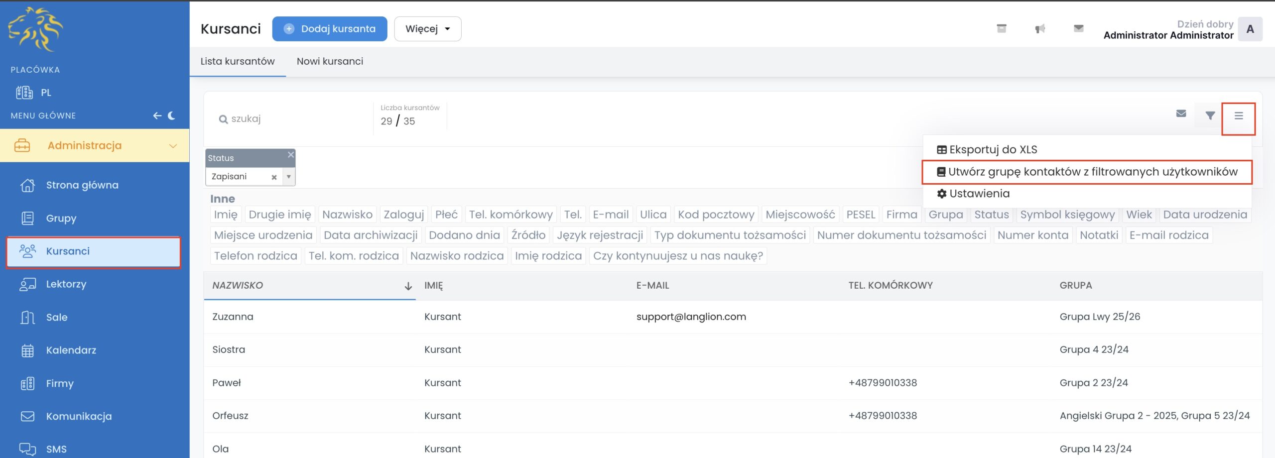 Przejdź do zakładki „Kursanci”, wybierz za pomocą filtrów odpowiednie osoby, np. te z konkretnej miejscowości. Następnie kliknij na opcję „Więcej” i wybierz „Utwórz grupę kontaktów z filtrowanych użytkowników”. Potwierdź komunikat systemowy i przejdź do edycji samej grupy. W nowym oknie możesz nadać jej odpowiednią nazwę.
