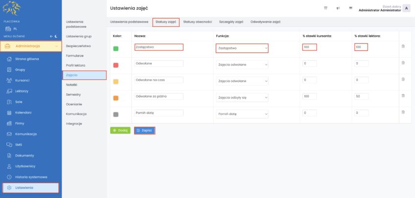 - Kliknij w zakładkę „Zajęcia” -> „Statusy zajęć” i wybierz opcję „Dodaj”.