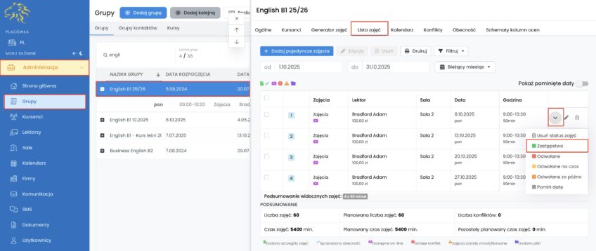 Zdarza się, że lektor zachoruje lub pojawi się sytuacja, która uniemożliwi mu prowadzenie zajęć z grupą. W takim przypadku trzeba zorganizować zastępstwo, które także możesz wprowadzić do Platformy LangLion. Prawidłowe ustawienia sprawią, że system w prosty sposób wprowadzi zastępstwo w grupie. W pierwszej kolejności dodaj nowy status zajęć – zastępstwo.