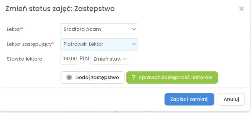 5. W oknie edycji zastępstwa wybierz lektora zastępującego. Możesz także sprawdzić, czy w tym czasie są dostępni lektorzy – kliknij w przycisk „Sprawdź dostępność” i automatycznie zostanie przypisany lektor, który nie prowadzi w tym czasie zajęć. Przypisz stawkę lektorowi i zapisz zmiany przyciskiem „Zapisz i zamknij”.