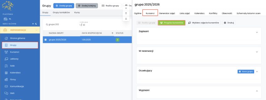 2. Wybierz właściwą grupę i kliknij w zakładkę „Kursanci”.